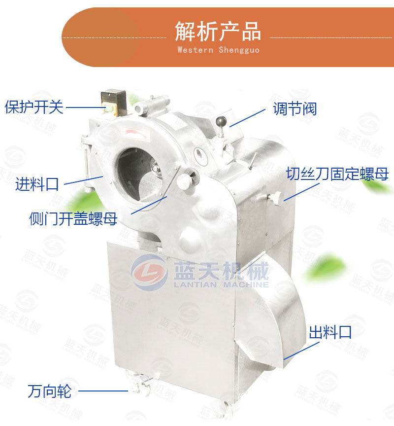 除了进料口、出料口外,还有其他位置的部件与物料切出的形状质量息息相关,香蕉视频免费在线播放要熟悉一下:调节阀、切丝刀固定螺母、侧门开盖螺母,保护开关。保护开关提高了山药片机器操作的安全性。切山药机底部安装的有万向轮,方便移动。